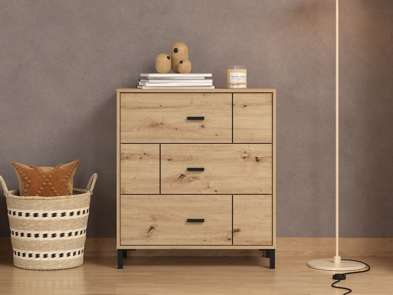 Komoda ALERIA 80 3F izrađena je u toplom artisan hrast dekoru, koji donosi prirodnu i rustičnu notu u prostor. Jedinstveni print sa crnim prugama dodatno naglašava strukturu drveta, stvarajući vizuelno zanimljiv i upečatljiv kontrast, dok su crne, elegantno oblikovane ručice i nogari pažljivo usklađeni sa dekorom. Time se postiže harmoničan i sofisticiran izgled. Opremljena sa tri duboke, prostrane fioke, ALERIA 80 3F omogućava lako organizovanje garderobe, posteljine ili ličnih stvari. Takođe, ova komoda je deo istoimenog sistema elemenata ALERIA, kompletnog rešenja za moderno opremanje spavaće sobe. Zahvaljujući spoju funkcionalnosti i estetike, savršeno se uklapa u minimalističke, ali i toplije, prirodno inspirisane enterijere. Komodu možete dekorisati veštačkim cvećem u saksiji ili dekorativnim biljkama u ampulama.