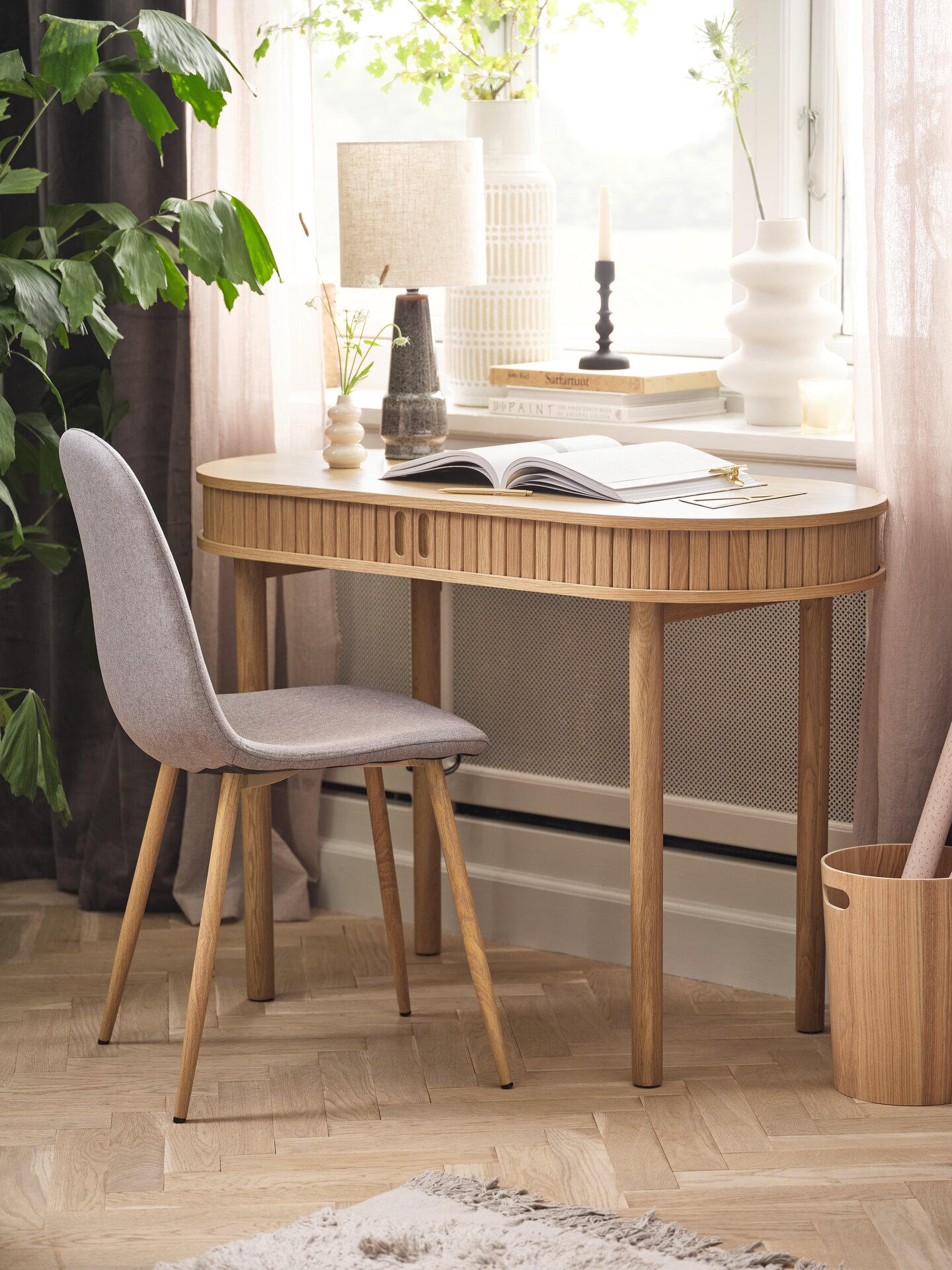 U dnevnoj sobi to znači: sofa u svetlim tonovima, drveni sto čistih linija, vaze od keramike nepravilnih oblika i pletene korpe od jute. Sve izgleda spontano, ali promišljeno – kao da prostor ima sopstvenu tišinu.
