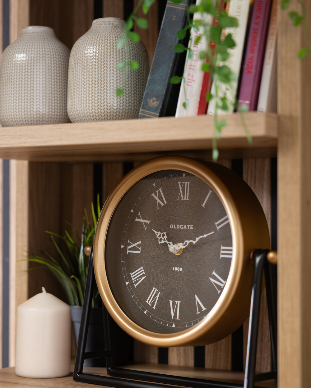 Uredite police omiljenim knjigama i dekorativnim svećama, a pažnju usmerite na stoni sat ATMOSPHERA – upečatljiv detalj u zlatnoj boji s crnim nogarima. Takav kontrast unosi moderan ritam u prostor. Za dodatnu toplinu, birajte vaze sa svežim cvećem i sveće u tonovima koji se nadovezuju na neutralnu osnovu enterijera – zlatnu, crnu i prirodne nijanse.