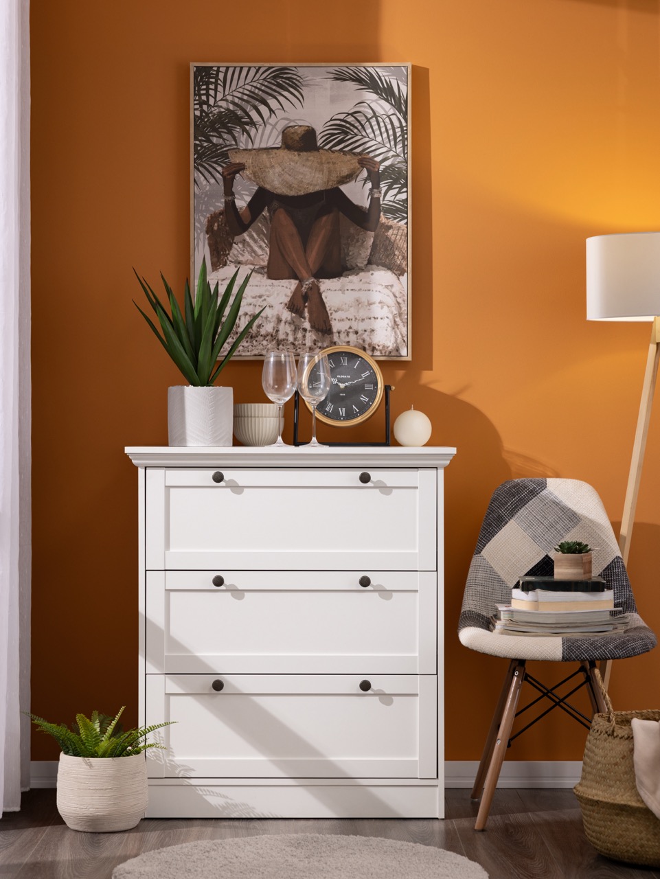 Komoda LANDWOOD 3 predstavlja savršeno rešenje za odlaganje, bilo da se koristi kao dodatni komad nameštaja u dnevnom boravku ili praktično mesto za skladištenje u predsoblju. Klasični detalji, poput dekorativnih bordura i diskretnih ručica na tri fioke, ističu njen bezvremenski dizajn. Kao deo istoimene kolekcije, lako se kombinuje s drugim elementima istog stila.