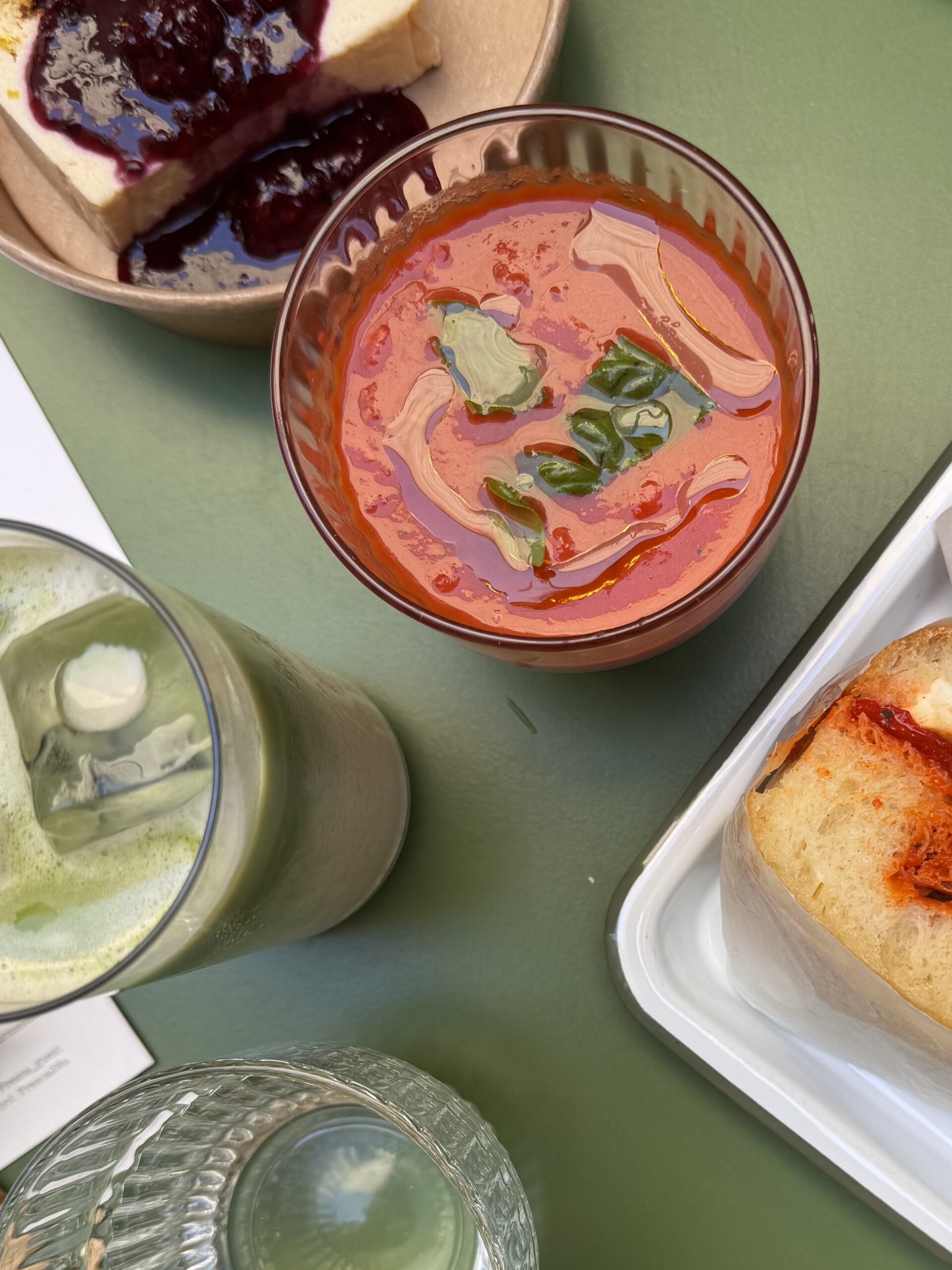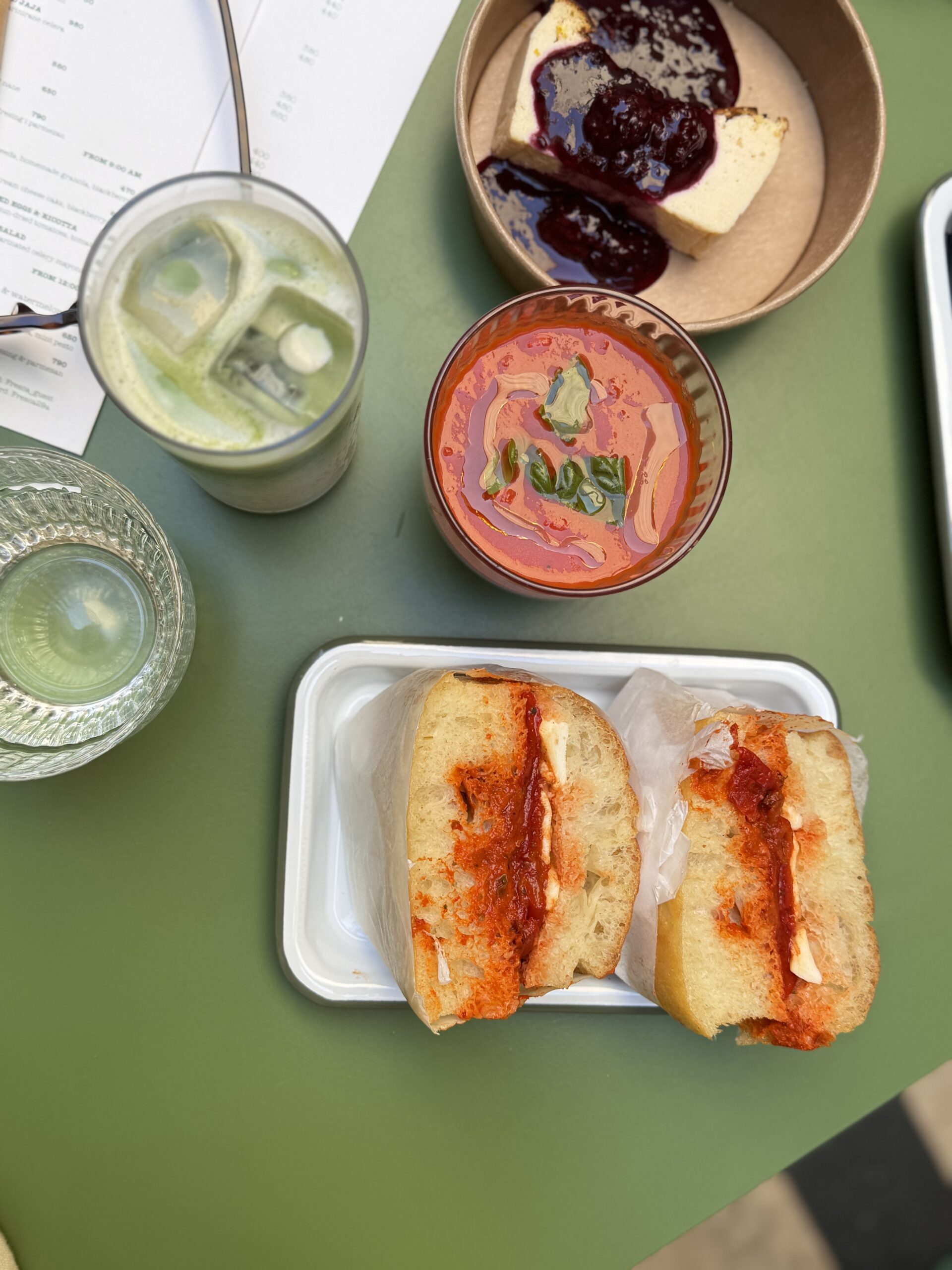 Brend-šef Nataša Berezova i kuvar Anton Krasikov od 9h služe domaću granolu sa čijom i kupinama (470 rsd), nežne rikota-kolačiće sa kupinovim džemom (620 rsd) i sendviče na fokači – na primer sa skremblom, rikotom, sušenim paradajzom i paradajz-džemom (730 rsd). Najsnažnija opcija za doručak je sa tankim listićima teletine (marinirana prethodnog dana i kuvana sous-vide sedam sati) i salatom od jaja (980 rsd). Za vegeterijance postoji sendvič sa mariniranom paprikom, mocarelom i muhammarom (750 rsd). Od podneva u meniju se pojavljuje još više specijaliteta: od gaspača od lubenice sa paradajzom, pečenom paprikom i svežom lubenicom do salate sa mocarelom i sezonskim breskvama (650 rsd) ili Cezara sa hrskavom piletinom i anćuos majonezom (790 rsd).