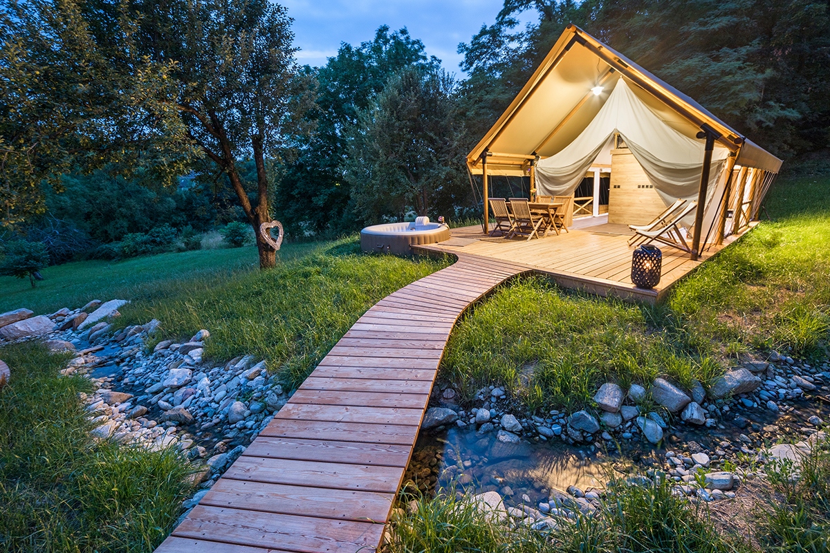 Pažljivo raspoređeni šatori luksuznog enterijera zimi se zagrevaju na 24 stepena, a samo vas tanak sloj šatora odvaja od zimskih temperatura koje prevladavaju u ovom planinskom predelu. Šatori su opremljeni poput luksuznog hotela; TV, kupatilo, ali i jacuzzi samo su deo usluge koju pruža ovaj bajkoviti glamping. U blizini šatora smeštena je stara kućica koja je pretvorena u tradicionalni slovenski restoran u kom uživaju gurmani iz svih delova sveta, a u kojoj možete probati prave slovenske specijalitete kao što su domaće knedle ili tradicionalni srneći gulaš. Osim restorana, u neposrednoj blizini prostire se vinograd, kao i Ramšakov vinski podrum u kom možete probati lokalna vina ali i isprobati nešto drugačiju uslugu – vinsku masažu s uljem grožđa.