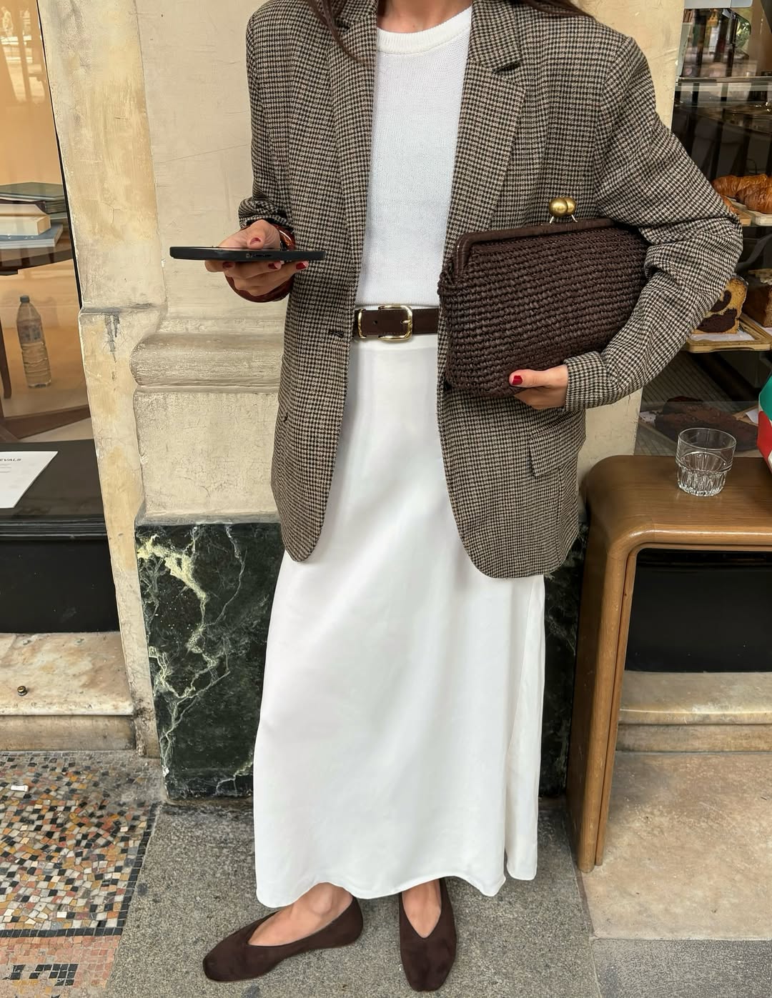 Ove jeseni, paleta boja igra ključnu ulogu. Umesto jarkih i kontrastnih kombinacija, fokus je na neutralnim tonovima, zemljanim nijansama i monohromatskim kombinacijama koje odišu smirenošću. Boje poput bež, krem, karamel, tamnosive ili mat-crne stvaraju osnovu garderobe koja se lako kombinuje i pruža osećaj harmonije. Povremeno se mogu dodati diskretni akcenti u toplim nijansama, poput bakarne ili boje cigle, ali oni služe više da unesu dozu sofisticirane dinamike nego da naruše suptilnost outfita. Kroj odeće takođe odražava minimalističku estetiku. Fokus je na čistim linijama, kvalitetnim materijalima i jednostavnim siluetama koje laskaju figuri, ali ne preteruju u detaljima. Jakne i trench mantili srednje dužine, kaputi sa blagim strukiranjem i ravne pantalone sa mekanim padom materijala postaju osnova jesenske garderobe. Lagane rolke ili džemperi od kašmira dodaju toplinu, dok njihova jednostavnost omogućava da svaki izgled ostane elegantan i skladan. Minimalistički stil neguje ravnotežu između komfora i estetike, pa je važno da svaki komad odiše smirenošću, ali da u isto vreme izgleda promišljeno.